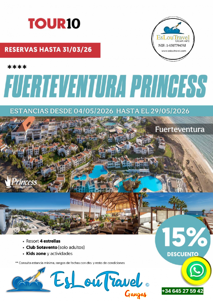 PIDENOS TU RESERVA 15% DESCUENTO EN FUERTEVENTURA PRINCESS ESTANCIA 04/05/2026 HASTA 29/05/2026.