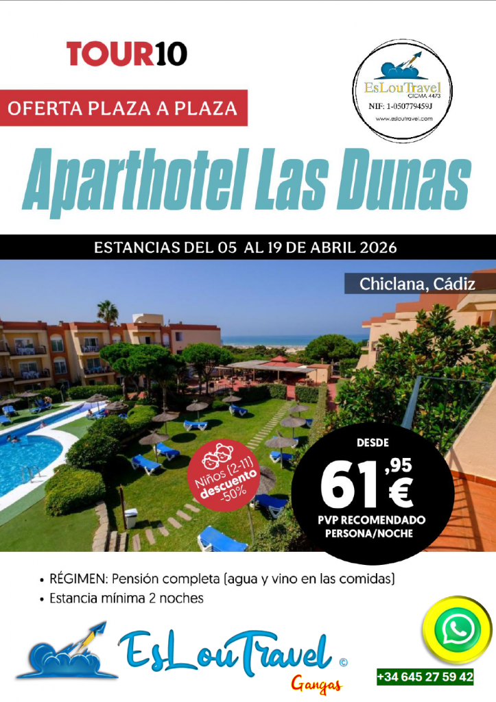 PIDENOS TU RESERVA APARTHOTEL LAS DUNAS ESTANCIA 5 AL 19 ABRIL 2026 DESDE 61 EUROS.